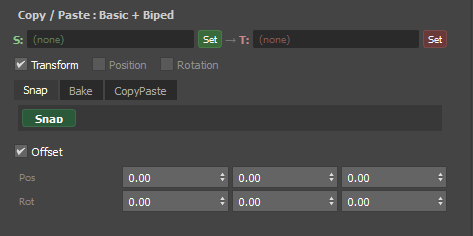 일반 노드 또는 Biped 노드 간의 트랜스폼(위치·회전)을 복사·적용하는 고급 스냅 기능입니다.