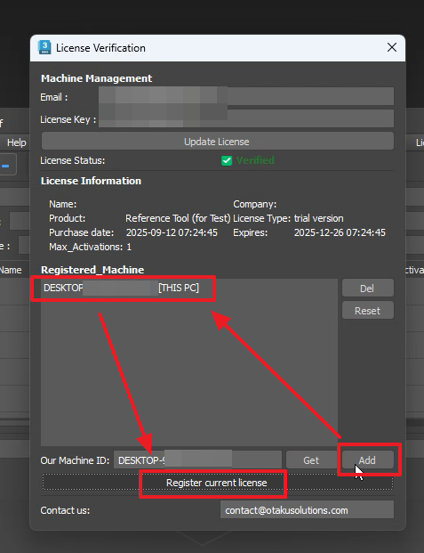 然后进入 Machine ID → [Add] → [确认机器ID注册] → [Register Current License],注册许可证信息和