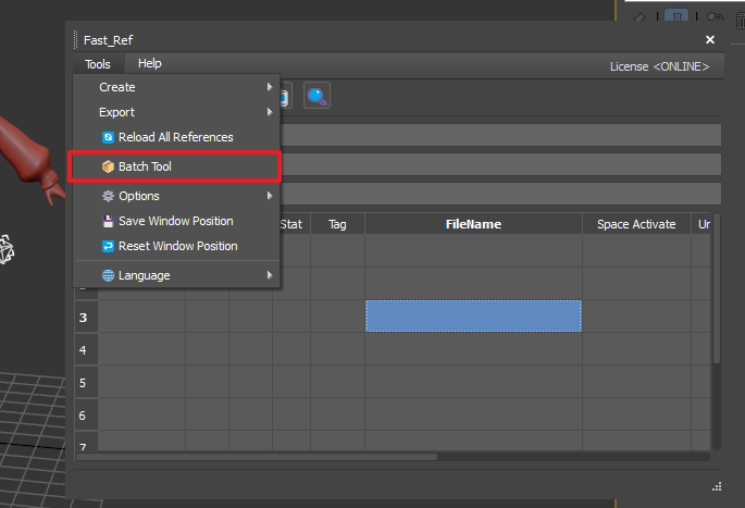 - パス:[Fast-Ref] メニュー → [Tools] メニュー → [Batch Tool] ボタンをクリック