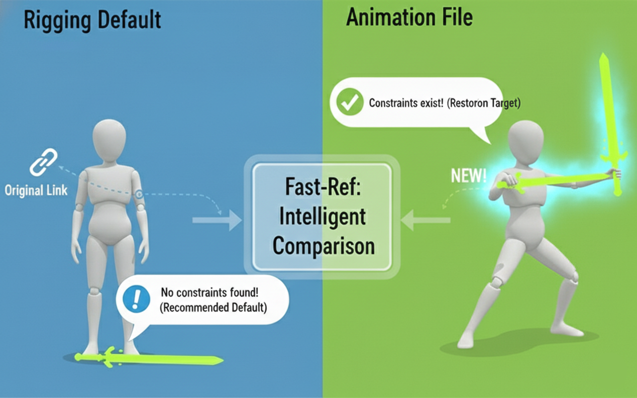 - Reason: If links already exist in the source, Fast-Ref may mistake the user's newly set links in the animation file as **"something that was already there"** and exclude them from restoration (Skip).