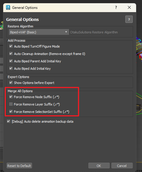 | Force Remove SelectionSet Suffix (.r*) | ✅ ON | 从 SelectionSet 名称中移除后缀(存在同名时自动合并) | Export 脚本通常通过 SelectionSet 名称指定分组,留有后缀可能导致兼容性问题 |