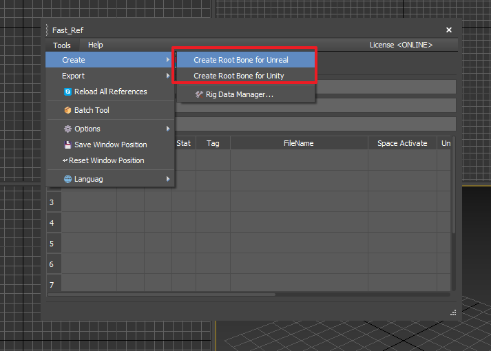 为了更顺畅的工作流程,您可以在工具菜单中创建 Unreal / Unity 用的 Root 示例骨骼。