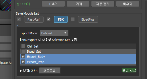 | Export Selection Set | Auto モードの代わりに、指定した Selection Set を基準に FBX 抽出 |