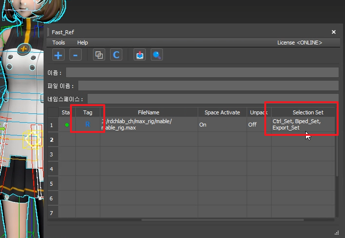 Fast-Ref에서 불러오면 R 태그가 표시되며, 리깅 구조와 셀렉션 셋이 함께 자동 복원됩니다.